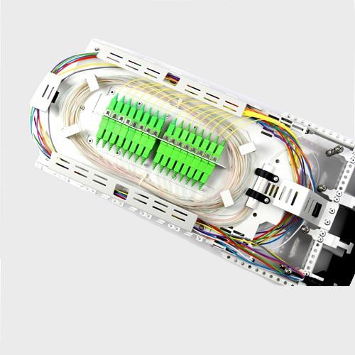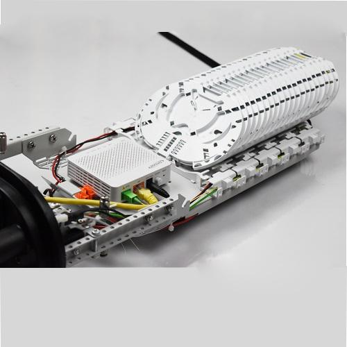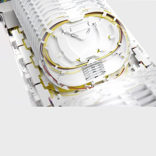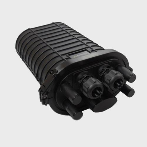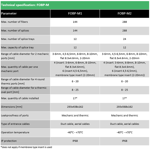 Fibrain FOBP fiber optic closure is the element which is used to connect and protect the fiber optic connections in different applications. FOBP-Mx series of the closure is characterized by the hybrid construction of the base – base is equipped with thermally sealed cable entry ports and ports with mechanical seals. The fiber optic closures are specifically designed for connecting optic routes as well for branchings. Fibrain FOBP closure can be places in aerial application or wall-mounted in the manholes. FOBP thermo-mechanical closure is equipped with 2 round mechanical ports which can be equipped with inserts that multiply the number of entered cables, 4 round ports for single cable with max. diameter Ø20 mm and one oval entrance for uncat cable. Seal variants (inserts) for mechanical ports are available in several variants – with a strictly defined diameter and number of cable entries and also membrane type insert for aerial application, which allows entered cables with different diameters (max. diameter for single entered cable Ø24 mm). Depending on the size the fiber optic closure capacity is up to 144 or 288 fibers. FOBP closure can be equipped with adapters panel (9x SC SX for 144F, 18x SC SX for 288F closure). The closure can be widely used in all types of FTTx telecommunications system architecture.